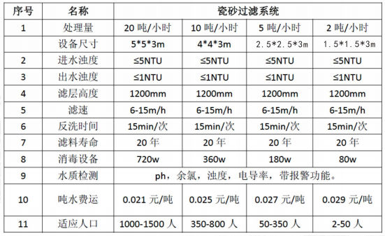 本系統采用原水經過自壓壓進入過濾器,原水與瓷砂濾料進行充分接觸攔截,不僅能夠截留 水中雜質,而且還能夠保證出水水質穩定,系統運行達到設定值時,自動啟動設備切換進行反沖 洗,無人值守自動控制系統自動如此往復運行,保證飲水指標,達到安全供水。